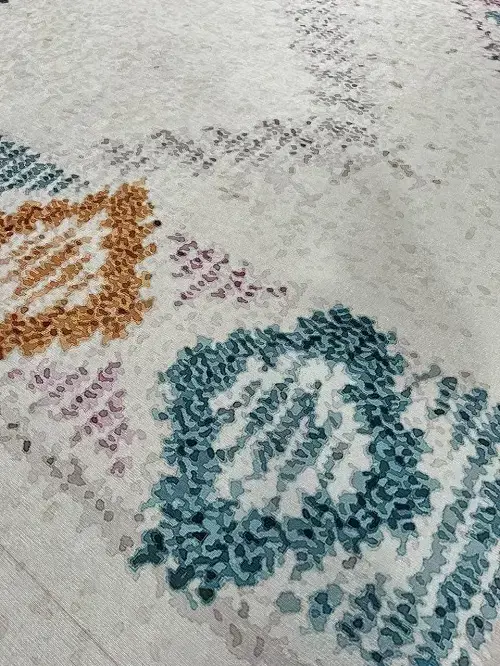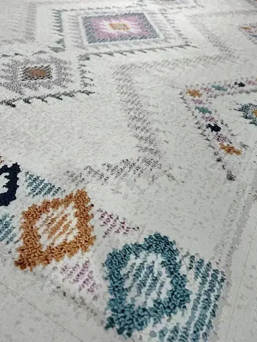 زمینهی اصلی این محصول به رنگ کرم مایل به نخودی روشن است؛ رنگی گرم و هماهنگ که با اغلب چیدمانهای داخلی همخوانی دارد. بر روی این زمینهی آرامبخش، طرحهایی هندسی و لوزیشکل در ترکیبی از رنگهای بنفش، آبی فیروزهای، سبز زیتونی، نارنجی تیره و مشکی بهصورت متقارن چیده شدهاند و حسی از نظم، انرژی و اصالت را به محصول بخشیدهاند.