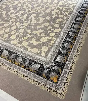 حاشیههای ظریف با ترکیب رنگهای مشکی، طلایی و طوسی تیره، به طرح عمق و جلوهای مجلل بخشیدهاند و باعث میشوند روفرشی از یکنواختی خارج شود.