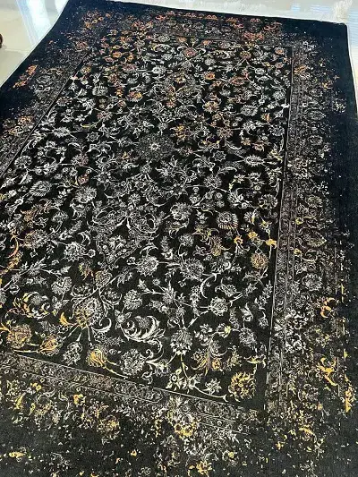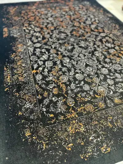 فرشینه کد C734 بارنگبندی مشکی با نقوش طلایی و سفید، انتخابی بینظیر برای کسانی است که به دنبال جلوهای هنری، اصیل و چشم نواز در دکوراسیون منزل خود هستند. نقوش گل وبوتهای متراکم و قابدار، هماهنگ با سبکهای سنتی ایرانی، شکوه و زیبایی خاصی به فضا میبخشند.
