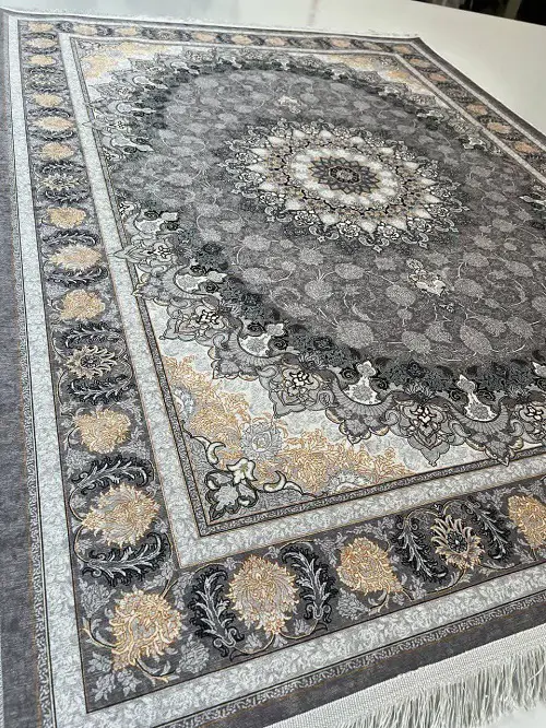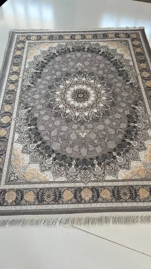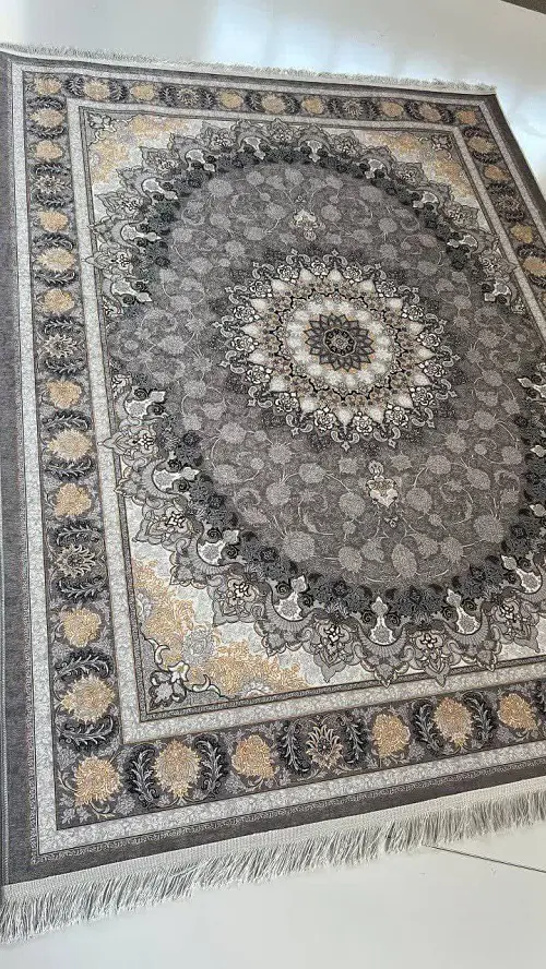 طراحی خاص: زمینهی طوسی با گلهای طلایی در حاشیه، جلوهای شیک و متفاوت ایجاد میکند که با اکثر چیدمانها هماهنگ است.