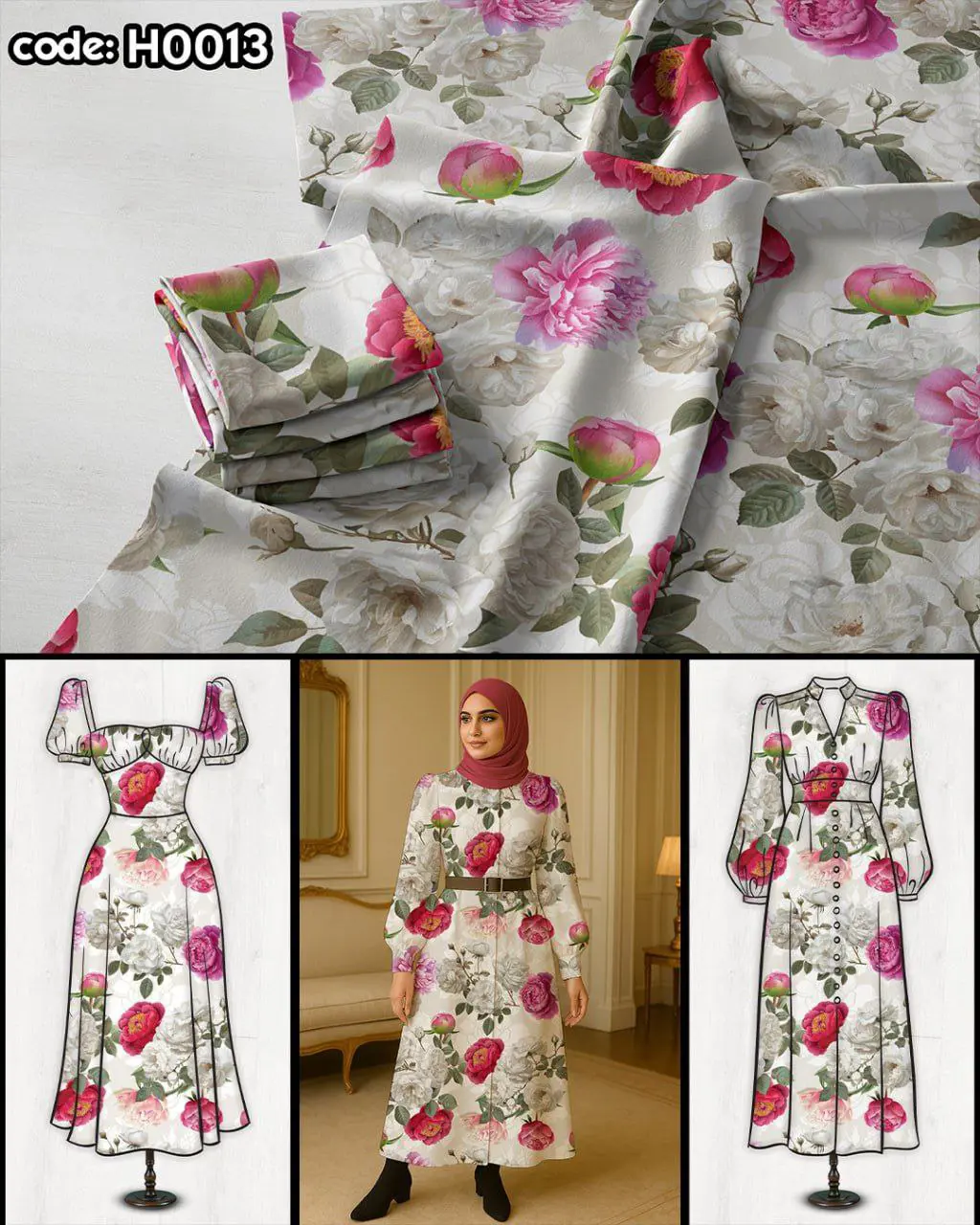 پارچه لباسی کد H0013 از مجموعه پارچه‌های خاص و باکیفیت برند ترمه کاور است که با چاپ دقیق، رنگ‌های زنده و طراحی منحصربه‌فرد، زیبایی و وقار را به استایل شما هدیه می‌دهد. این طرح برای دوخت انواع لباس‌های مجلسی، مانتو، سارافون و دامن بسیار مناسب است.