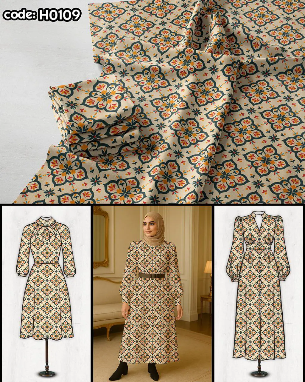 پارچه لباسی کد H0109 از مجموعه پارچههای خاص و باکیفیت برند ترمه کاور است که با چاپ دقیق، رنگهای زنده و طراحی منحصربهفرد، زیبایی و وقار را به استایل شما هدیه میدهد. این طرح برای دوخت انواع لباسهای مجلسی، مانتو، سارافون و دامن بسیار مناسب است.