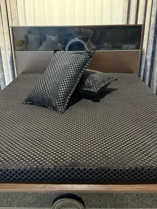 پارچهی استفادهشده در این محصول از نوع مخمل حبابی با طرح لوزی برجسته است که بافتی نرم، سهبعدی و ژرف دارد. این ویژگی علاوه بر زیبایی بصری، حس لمس بسیار لطیف و دلپذیری ایجاد میکند و جلوهای خاص به تخت میبخشد. سطح پارچه در نور طبیعی انعکاس ملایمی دارد و در زوایای مختلف از مشکی عمیق تا خاکستری تیره متغیر دیده میشود.